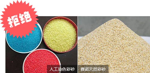 人工染色彩砂,經(jīng)久風蝕易褪色、泛白,破舊影響建筑整體美觀。賽諾采用河南、河北等地天然優(yōu)質(zhì)采砂,其裝飾效果明顯,長期使用不易褪色、泛黃、發(fā)白,保持建筑高端形象。