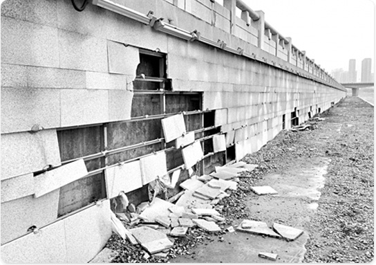 干掛石材造價高、增加墻體負重,易剝落增加危險性。